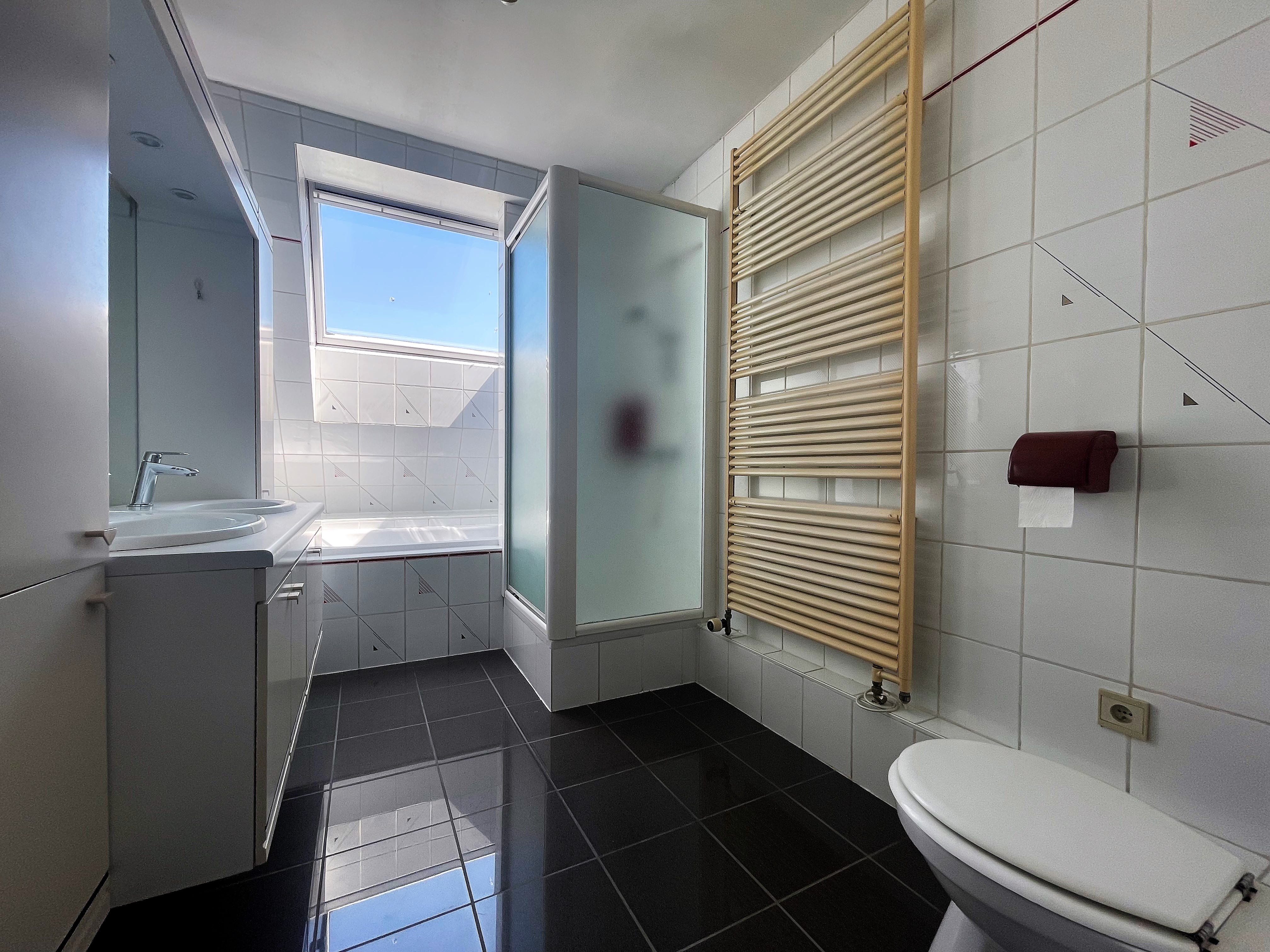 • Salle de douches: (3.94x2.16) 8.51m², carrelage, baignoire, douche, meuble double lavabo, wc, sèche serviettes