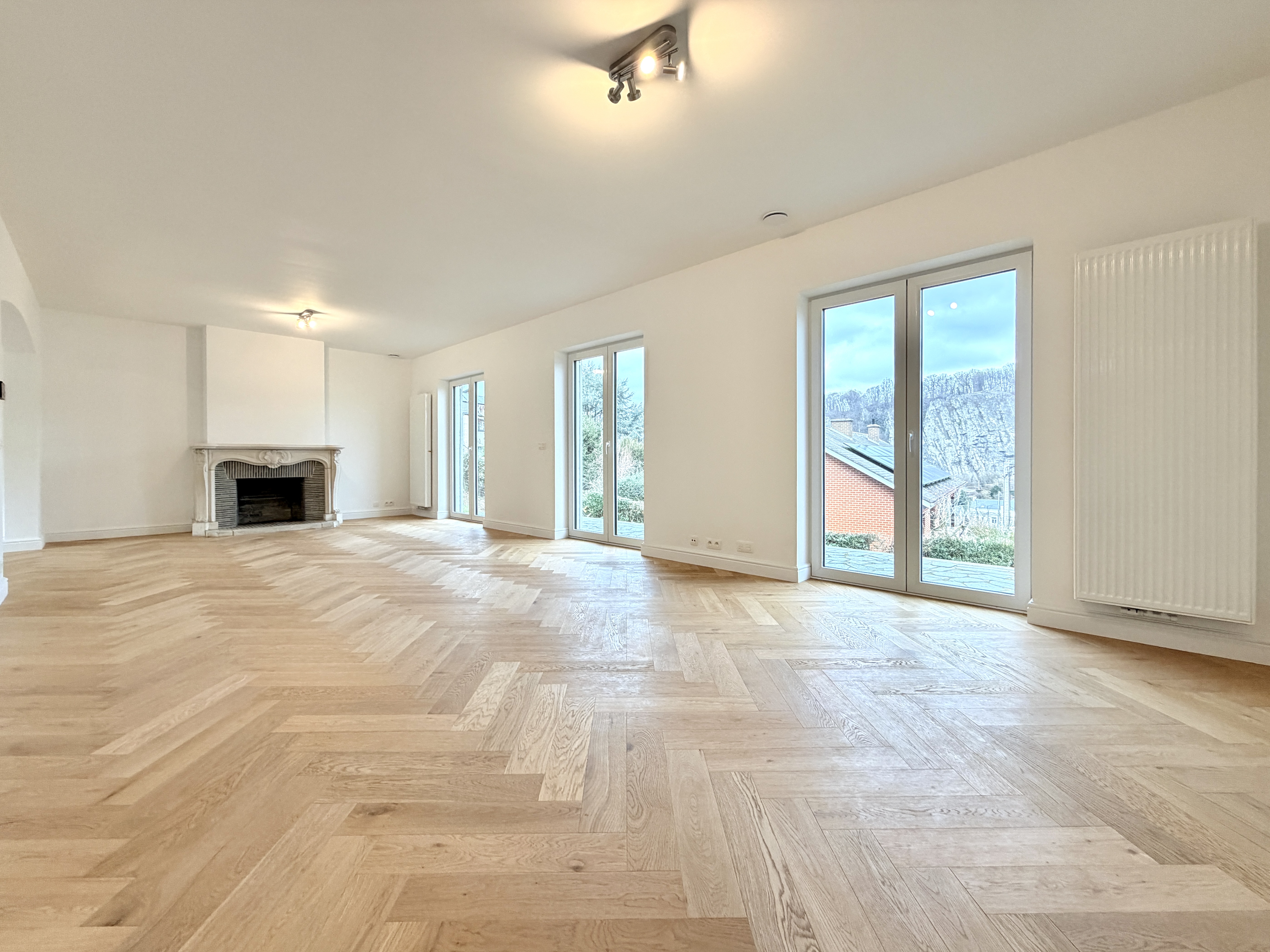 - Séjour: (4.21x9,45) 39,78m2, parquet en chêne massif en bâtons rompus, cheminée en pierre de France avec un feu ouvert, accès sur la terrasse, vue Meuse