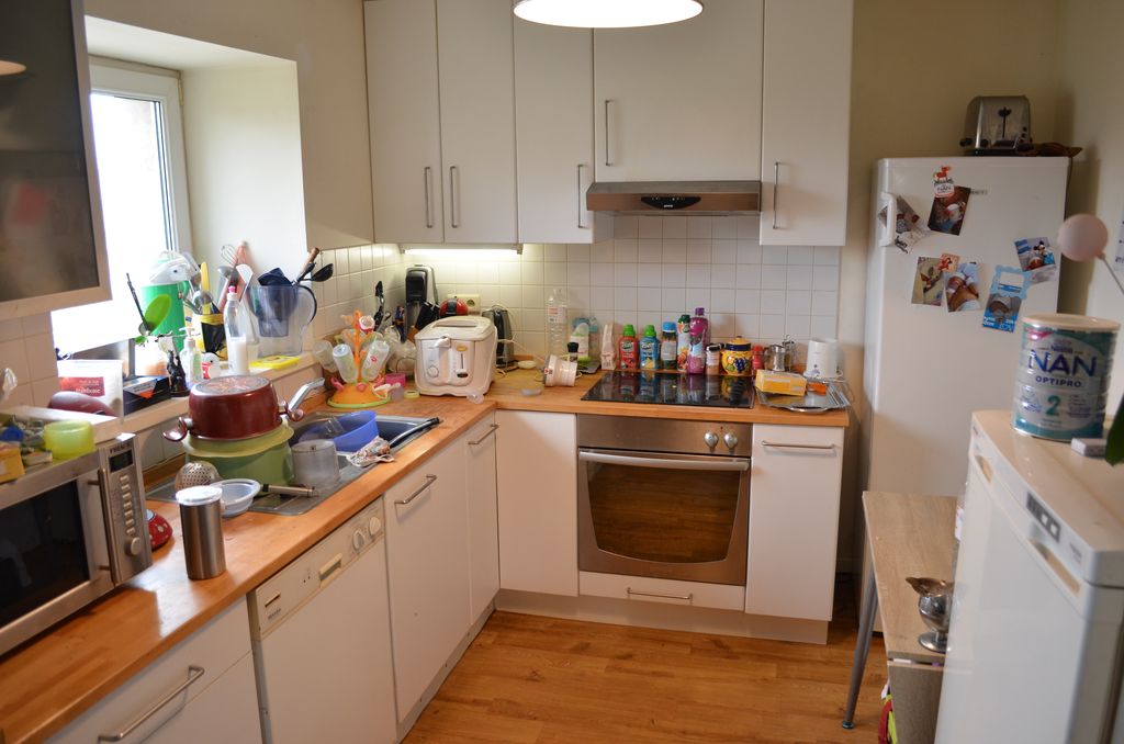- Cuisine équipée: (2.62x2.81) 7.39m², vinyle, double évier, taque vitrocéramique 4 points, hotte, four électrique, lave-vaisselle