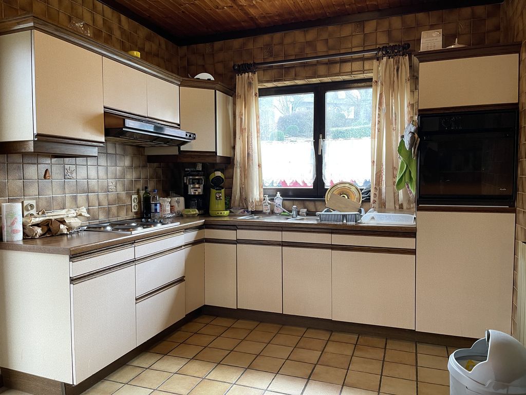 - Cuisine: (2.88x3.49) 10.05m², carrelage, double évier, hotte, four électrique, frigo, taque vitrocéramique, meubles de rangement
